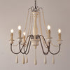 Ce lustre met en valeur de gracieuses perles de bois drapées sur des bras en volutes, alimentés par des ampoules style bougie. Des ornements suspendus en forme de goutte rappellent le motif vintage, tandis que le métal rouillé contraste avec une finition blanche vieillie pour un charme doux et rustique. Parfait pour les intérieurs classiques et féminins.