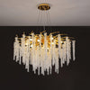 Ce lustre arbore un délicat motif de glycine, avec des pistils finement travaillés et de magnifiques touches de cristal. Son aspect luxueux et ses touches dorées créent une atmosphère élégante et scintillante dans tout salon.